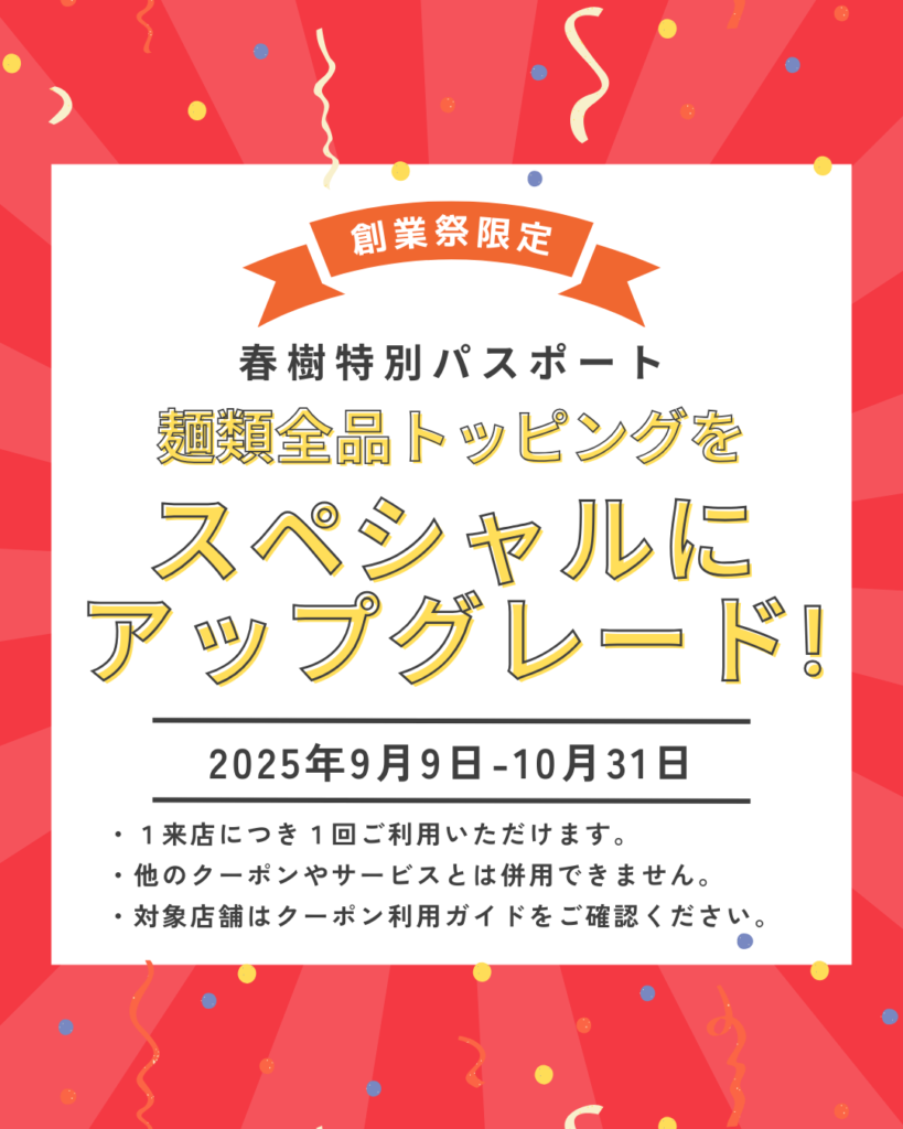 ※「ご注文の麺類全品 トッピングアップグレードパス」は次回来店から有効。期間中何度でも使えるパスとなっています。
